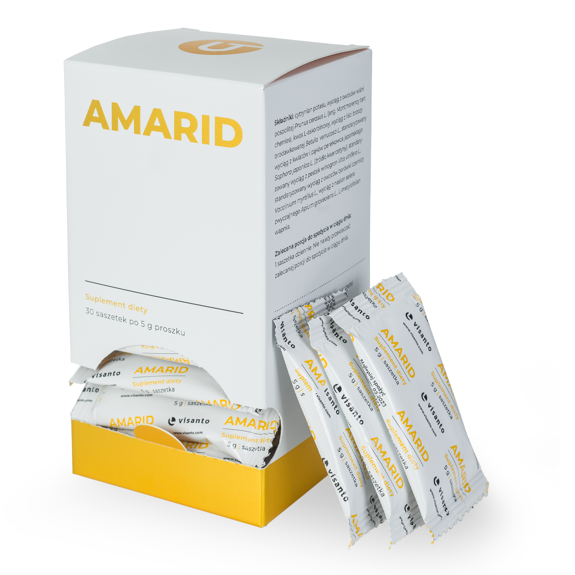 Cytrynian potasu, wyciąg z owoców wiśni pospolitej Prunus cerasus L. (ang. Montmorency tart cherries), kwas L-askorbinowy, wyciąg z liści brzozy brodawkowatej Betula verrucosa L., standaryzowany wyciąg z kwiatów i pąków perełkowca japońskiego Sophora japonica L. (źródło kwercetyny), standaryzowany wyciąg z pestek winogron Vitis vinifera L., standaryzowany wyciąg z owoców borówki czernicy Vaccinium myrtillus L., wyciąg z nasion selera zwyczajnego Apium graveolens L., L-metylofolian wapnia.