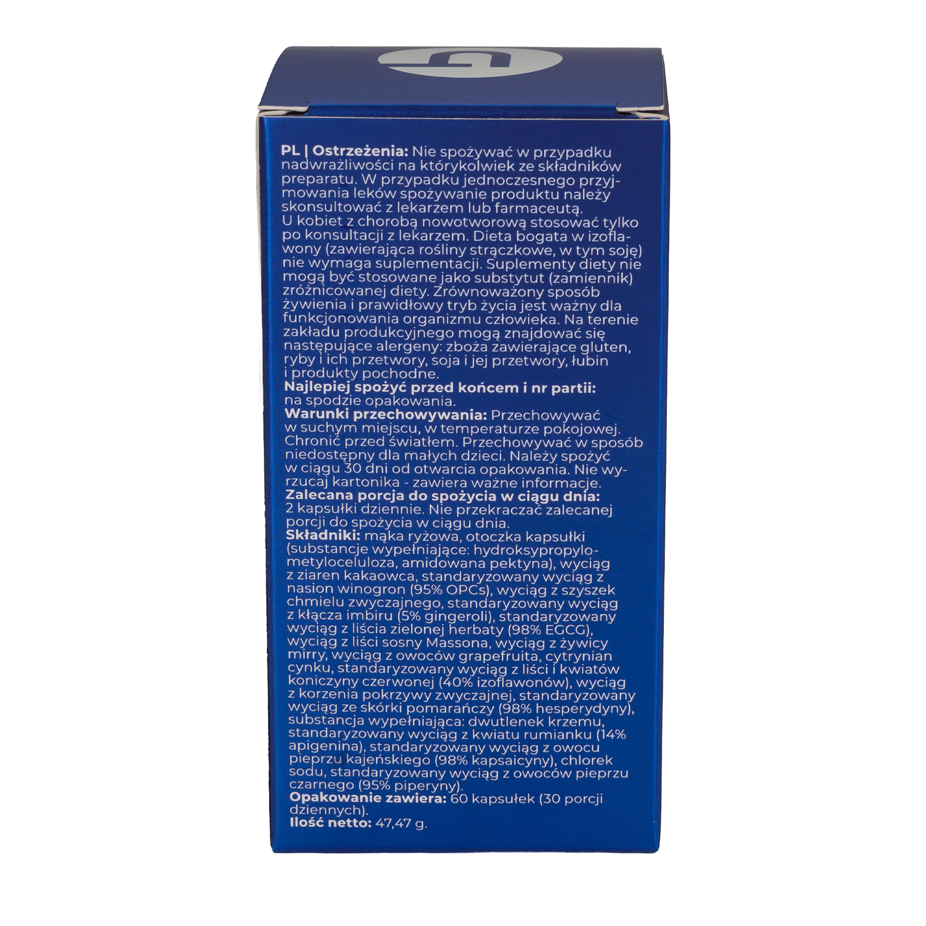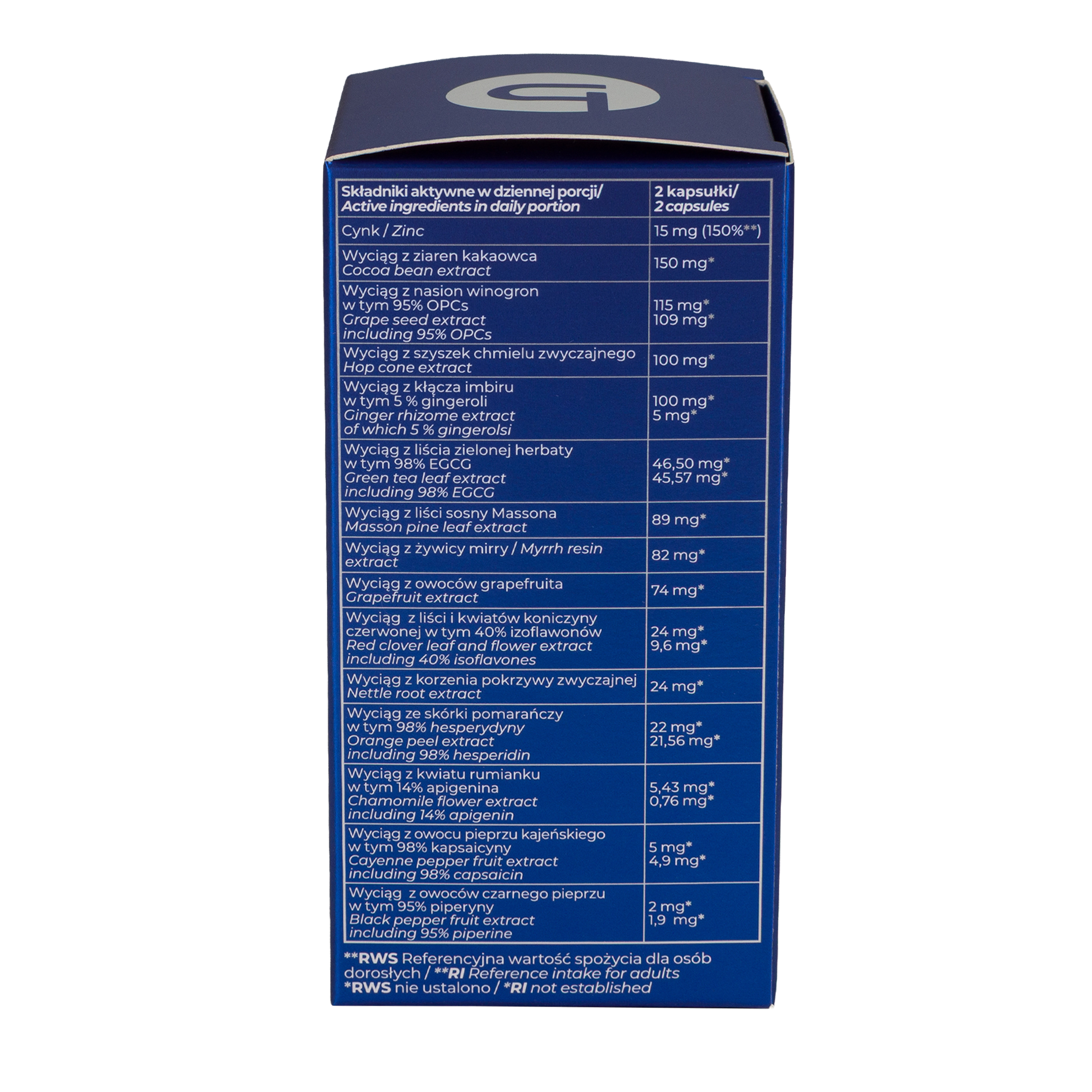 Składniki: Mąka ryżowa, otoczka kapsułki (substancje wypełniające: hydroksypropylometyloceluloza, amidowana pektyna), wyciąg z ziaren kakaowca, standaryzowany wyciąg z nasion winogron (95% OPCs), wyciąg z szyszek chmielu zwyczajnego, standaryzowany wyciąg z kłącza imbiru (5% gingeroli), standaryzowany wyciąg z liścia zielonej herbaty (98% EGCG), wyciąg z liści sosny Massona, wyciąg z żywicy mirry, wyciąg z owoców grapefruita, cytrynian cynku, standaryzowany wyciąg z liści i kwiatów koniczyny czerwonej (40% izoflawonów), wyciąg z korzenia pokrzywy zwyczajnej, standaryzowany wyciąg ze skórki pomarańczy (98% hesperydyny), substancja wypełniająca: dwutlenek krzemu, standaryzowany wyciąg z kwiatu rumianku (14% apigenina), standaryzowany wyciąg z owocu pieprzu kajeńskiego (98% kapsaicyny), chlorek sodu, standaryzowany wyciąg z owoców pieprzu czarnego (95% piperyny).