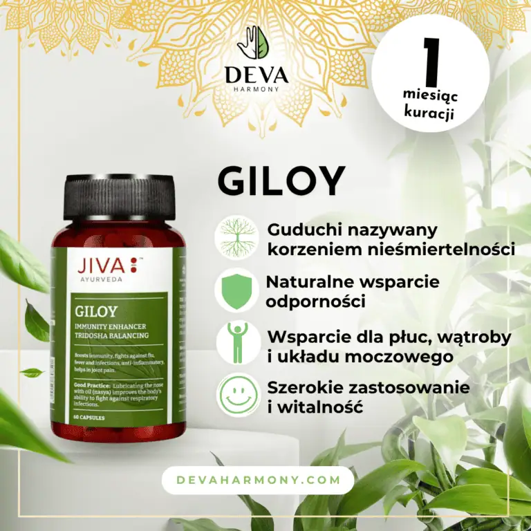 Kapsułki Giloy posiadają liczne właściwości zdrowotne ajurwedyjskiego cudownego zioła Guduchi. Wzmacnia naturalną odporność organizmu. Giloy ma również właściwości pomagające w utrzymaniu naturalnych mechanizmów obronnych organizmu. Pomaga w utrzymaniu zdrowia płuc. Wspiera zdrowie, oczyszczanie oraz zdolność do samoregeneracji wątroby.
