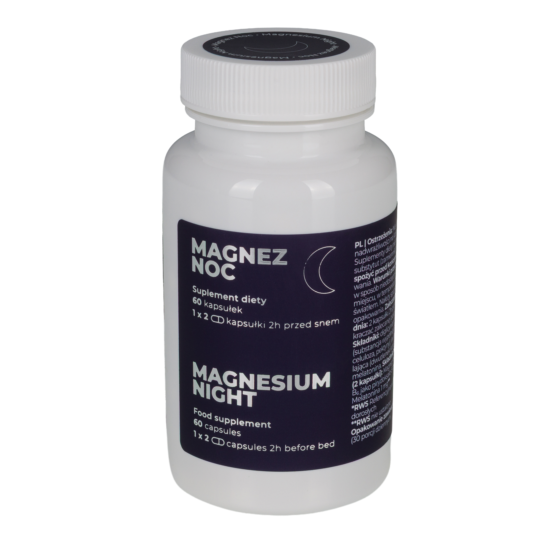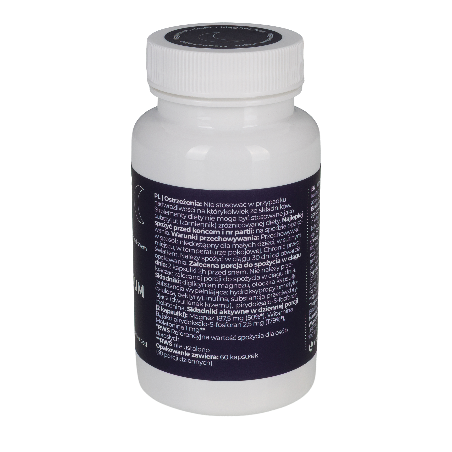 Składniki: diglicynian magnezu, otoczka kapsułki (substancja wypełniająca: hydroksypropylometyloceluloza, pektyny), inulina, substancja przeciwzbrylająca (dwutlenek krzemu), pirydoksalo-5-fosforan, melatonina.
