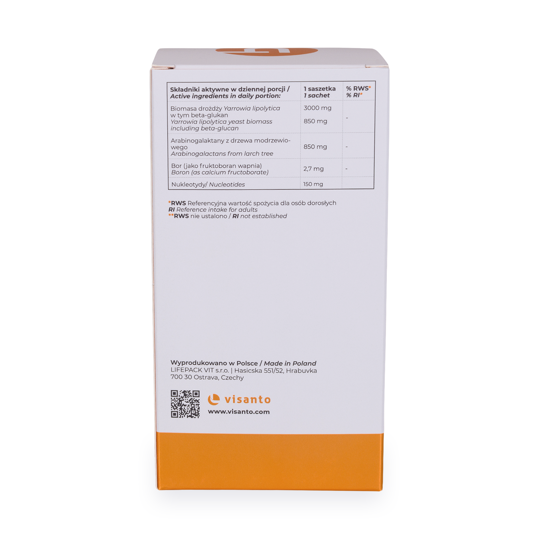 Składniki: biomasa drożdży Yarrowia lipolytica, arabinogalaktan z drzewa modrzewiowego Larix laricina, ekologiczny zmikronizowany błonnik jabłkowy, nukleotydy pochodzące z ekstraktu z drożdży Saccharomyces cerevisiae (substancja wypełniająca: guma akacjowa), fruktoboran wapnia (FruiteX-B®), liofilizat z ekologicznych owoców aroni.