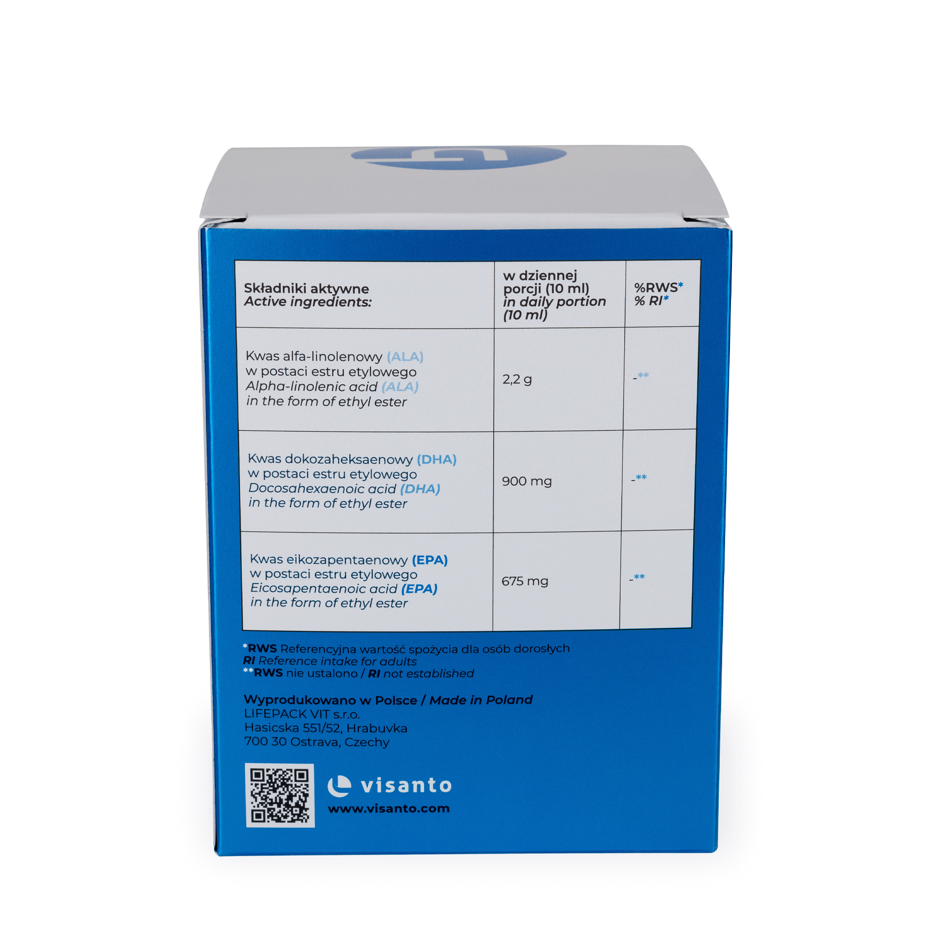 To suplement diety o skoncentrowanej zawartości trzech najważniejszych dla organizmu człowieka kwasów tłuszczowych z grupy OMEGA 3 (EPA, DHA, ALA). Zawarte w preparacie kwasy tłuszczowe omega występują w unikalnej formie monocząsteczek (estrów etylowych).