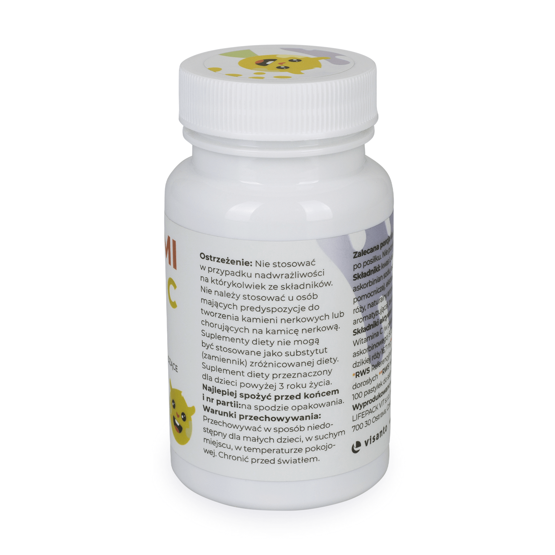 Składniki: kwas L-askorbinowy, sorbitol (substancja słodząca), askorbinian sodu, estry kwasów tłuszczowych (substancja pomocnicza), ekstrakt z owoców aceroli, ekstrakt z owoców dzikiej róży, naturalny aromat poziomkowy w proszku (substancja aromatyzująca), taumatyna (substancja słodząca)